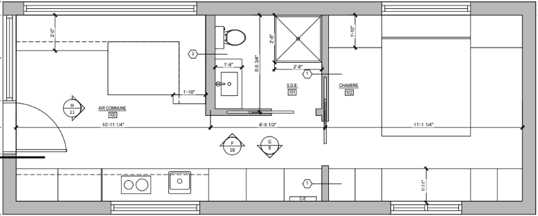 Le plan du T360 optimise chaque mètre carré : mudroom pratique à l’entrée, cuisine fonctionnelle avec espace repas, chambre fermée, et salle de bain généreuse. Un agencement fluide qui offre une véritable sensation d’espace, même dans un format compact.